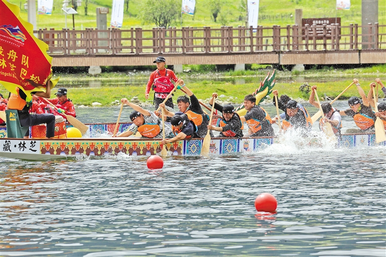 6月10日,2024年西藏林芝南迦巴瓦高原體育大會(huì)魯朗中尼高原龍舟友誼賽精彩上演。來自尼泊爾、新加坡和北京市、云南省以及拉薩市、林芝市等多地的8支龍舟隊(duì),百余名運(yùn)動(dòng)員奮力揮槳、激流勇進(jìn),為廣大群眾和游客獻(xiàn)上了一場(chǎng)水上競(jìng)技的“大餐”。