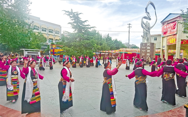 傍晚時分,日喀則市各族干部群眾在民族團結(jié)廣場跳鍋莊。