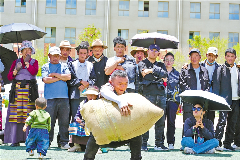 桑珠孜區(qū)城北街道舉辦慶祝第八個“日喀則市民族團結(jié)進步日”暨“全民來健身 健康你我他”社區(qū)運動會。這是參賽選手在進行抱石頭比賽。