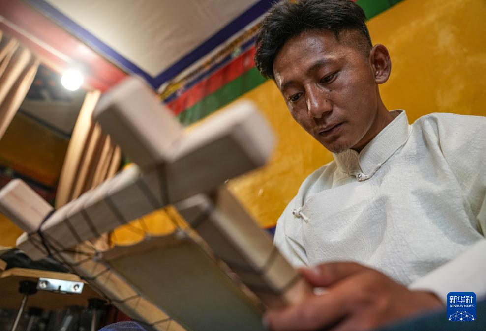 旦增特覺在店內(nèi)繪畫(7月5日攝)。他曾是一名唐卡畫師。新華社記者 晉美多吉 攝