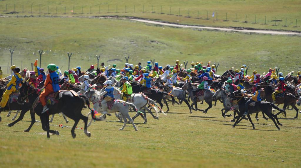 12日,10公里傳統(tǒng)大跑項(xiàng)目開賽,上百匹駿馬在草原上揚(yáng)蹄疾奔,騎手多是十來歲的少年。15歲的普扎巴從6歲開始做騎手,曾騎著當(dāng)?shù)卦S多名馬到各地參加比賽,拿過多次冠軍。“我相信這次也能拿第一名?!?0日,他在馬背上對(duì)記者說。