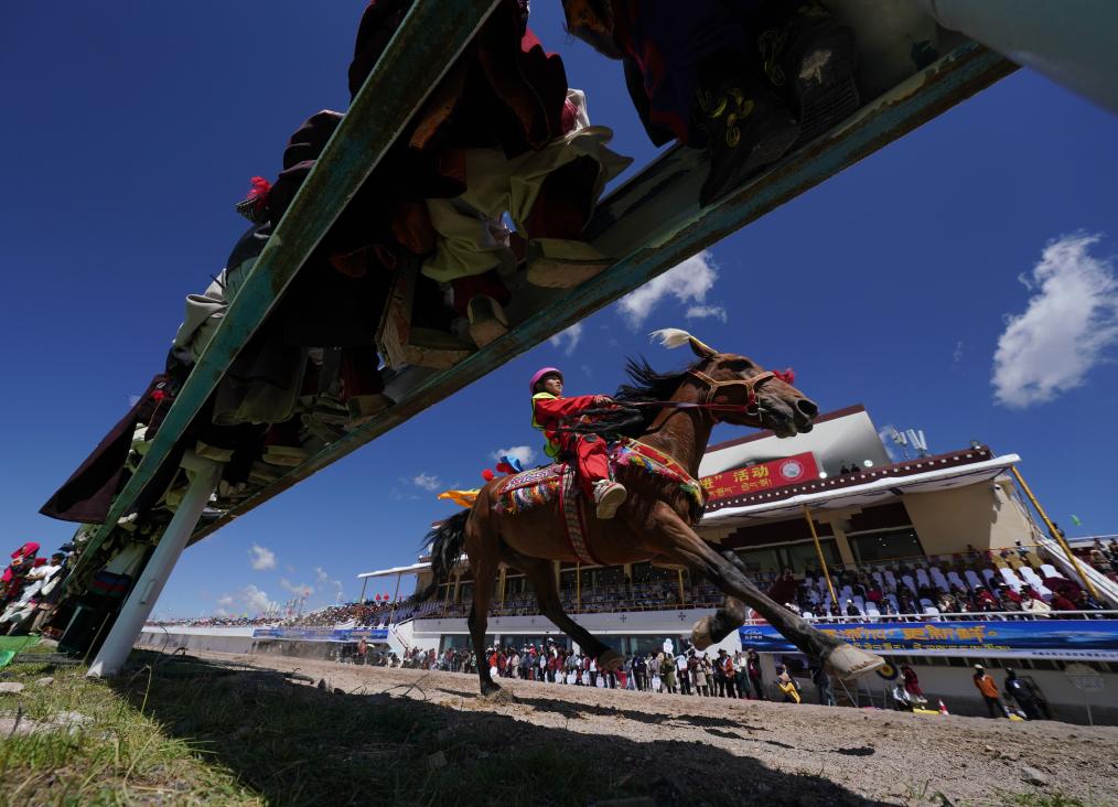 8月10日,觀眾坐在圍欄上觀看賽馬。新華社記者 晉美多吉 攝