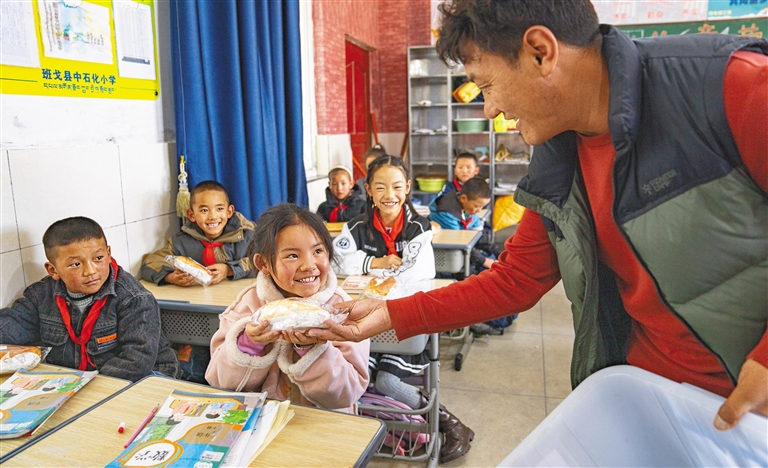 西藏那曲市班戈縣中石化小學是目前全國海拔最高的援藏小學,由中石化集團結(jié)對幫扶建立,2012年投入使用。圖為班戈縣中石化小學后勤副校長尼旦為學生們分發(fā)營養(yǎng)餐(資料圖片)。新華社記者 丁增尼達 攝