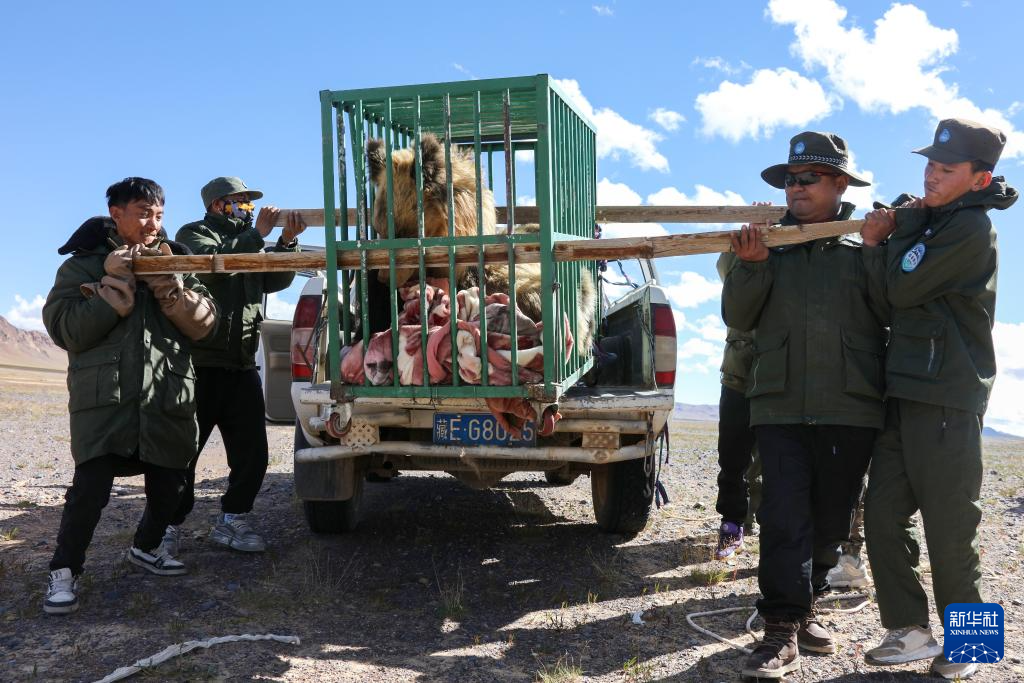 野保隊(duì)員將棕熊運(yùn)送至西藏那曲市尼瑪縣的羌塘國家級(jí)自然保護(hù)區(qū)核心區(qū)(8月30日攝)。新華社記者 姜帆 攝