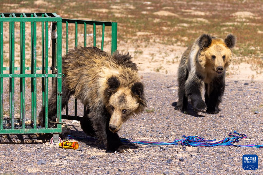 在西藏那曲市尼瑪縣的羌塘國家級(jí)自然保護(hù)區(qū)核心區(qū),被放歸的棕熊母子走出籠子(8月30日攝)。新華社記者 姜帆 攝
