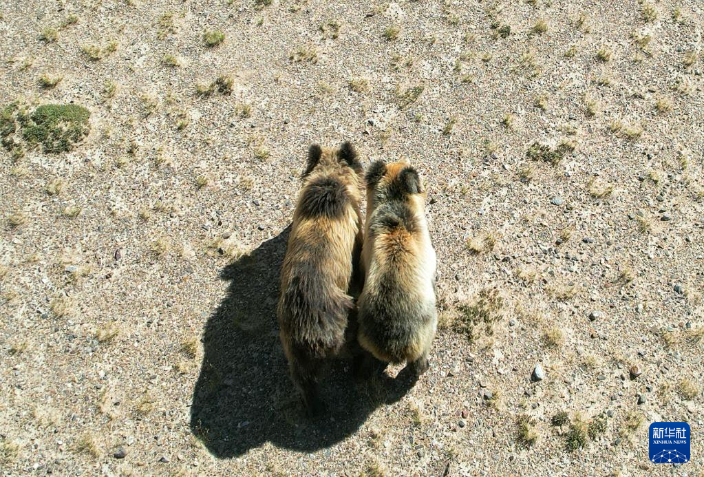 在西藏那曲市尼瑪縣的羌塘國家級(jí)自然保護(hù)區(qū)核心區(qū),被放歸的棕熊母子走向大自然(無人機(jī)照片,8月30日攝)。新華社記者 劉詩平 攝