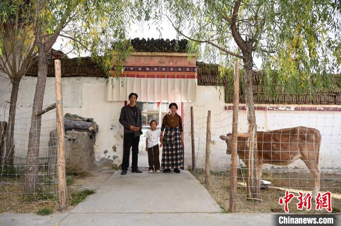 柳果村村民普瓊與家人在自家門前留影。中新網記者 貢確 攝