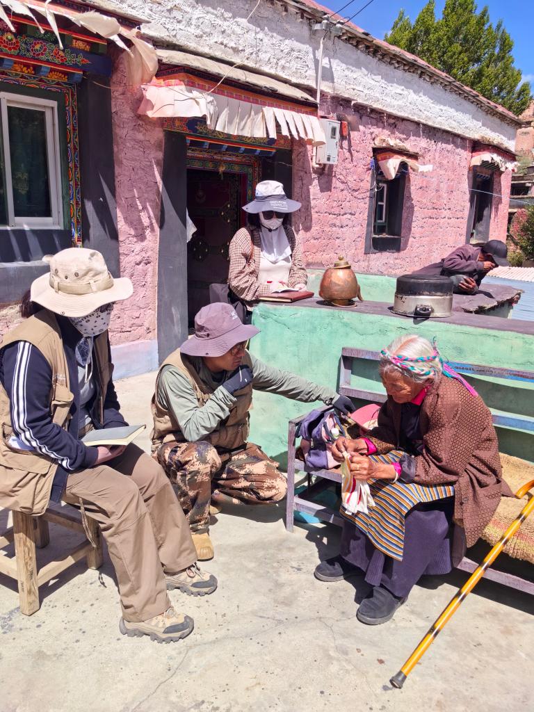 普查隊員在山南市曲松縣曲松鎮(zhèn)瓊嘎村向當(dāng)?shù)乩先俗稍冊摯鍤v史文化情況。(受訪者供圖)