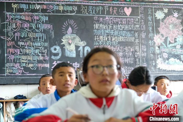 9月9日,西藏浪卡子縣中學(xué)一班級學(xué)生繪寫的教師節(jié)主題黑板報(bào),表達(dá)對老師的尊敬與感謝。中新社記者 江飛波 攝