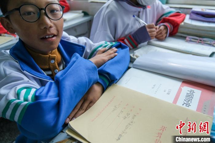 9月9日,西藏浪卡子縣中學(xué)初一年級學(xué)生展示他的中國歷史及藏語文教材。中新社記者 江飛波 攝
