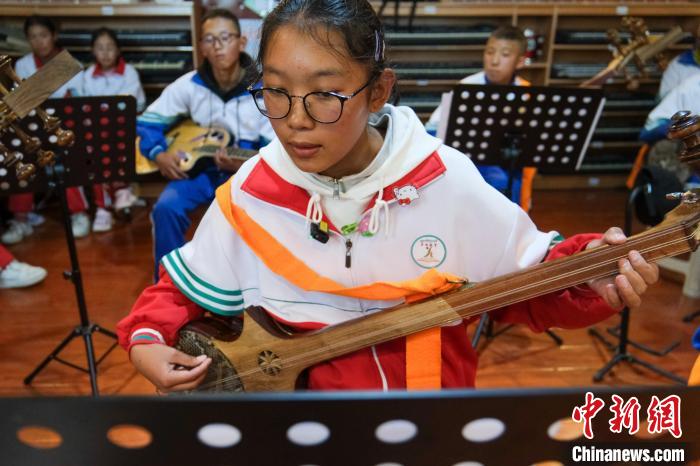 9月9日,西藏浪卡子縣中學(xué)初二年級白瑪卓嘎彈唱六弦琴。中新社記者 江飛波 攝