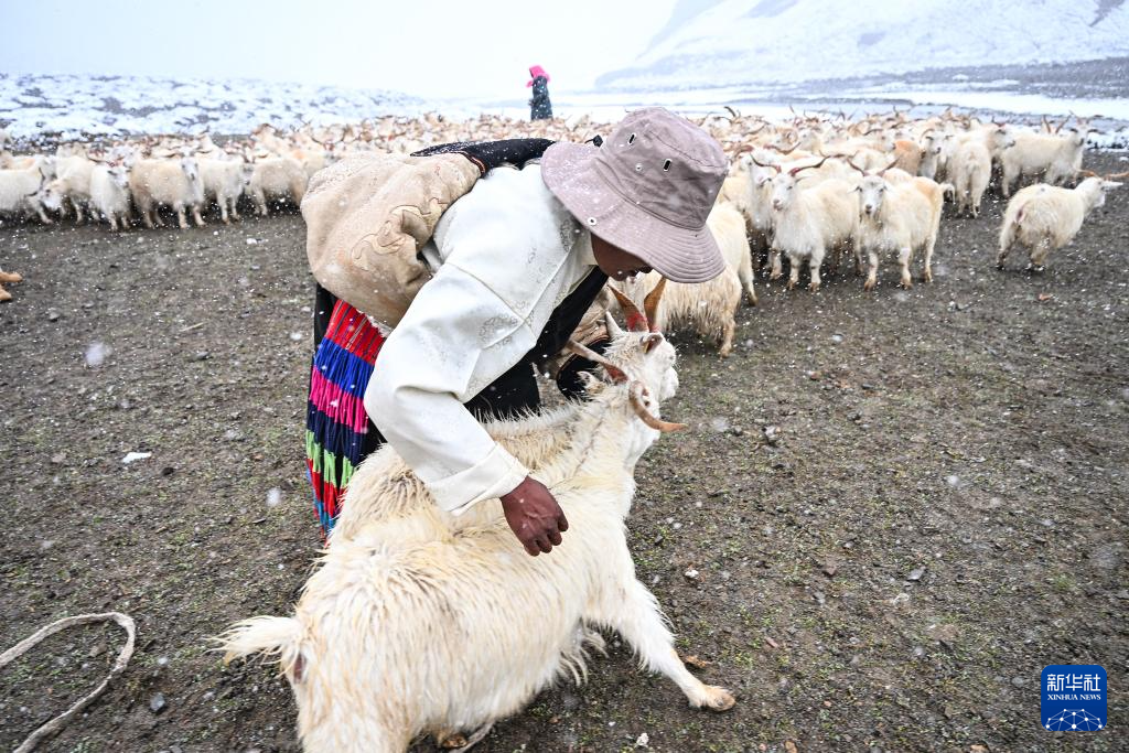 9月13日,在日土縣龍門(mén)卡村白絨山羊擴(kuò)繁場(chǎng),飼養(yǎng)員將白絨山羊收攏在一起,準(zhǔn)備給它們擠奶。新華社記者 孫瑞博 攝