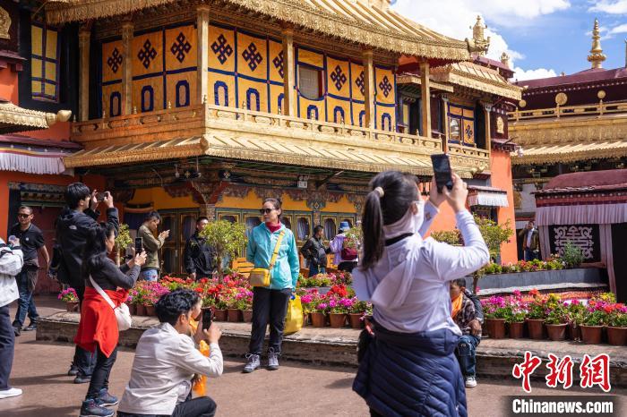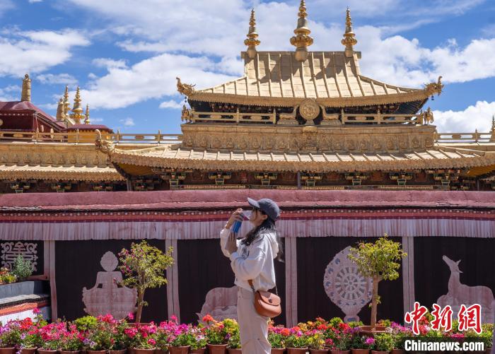 9月17日,游客在西藏拉薩大昭寺金頂前留影。中秋佳節(jié),距今已有1300多年歷史、2000年作為布達(dá)拉宮擴(kuò)展項(xiàng)目列入《世界遺產(chǎn)名錄》的拉薩大昭寺迎來(lái)眾多游客。中新社記者 貢嘎來(lái)松 攝