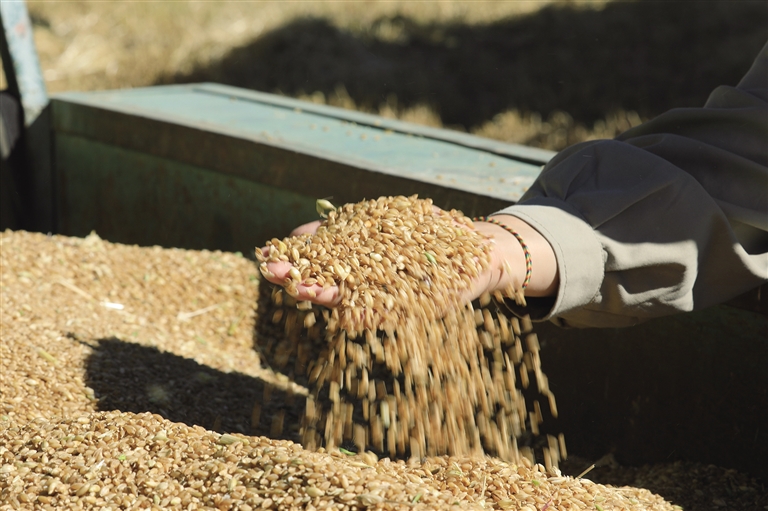 “我家共有92畝多的農(nóng)田,家里有三個勞力,我負責(zé)秋收,其余兩個外出務(wù)工,以前我們家秋收工作需要一個月多的時間,現(xiàn)在農(nóng)業(yè)機械化了,再也不用擔(dān)心秋收工作,聽說今年賣良種每斤有0.3元的補貼,準備把自家10000斤良種賣掉,預(yù)計今年有56000多元的收入?!闭诎徇\青稞粒的村民普瓊高興地說道。