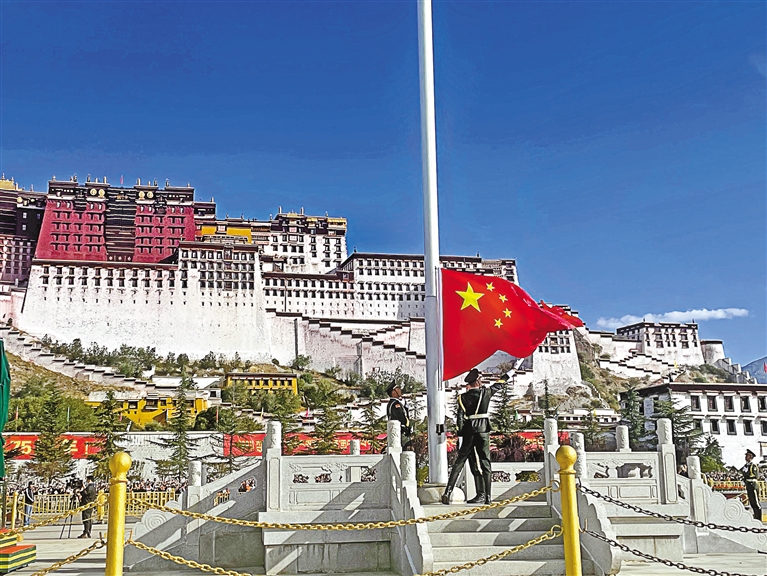 滿心中國紅、拳拳愛國情。10月1日上午,西藏舉行莊嚴(yán)的“升國旗、唱國歌”儀式,熱烈慶祝中華人民共和國成立75周年。自治區(qū)黨政軍領(lǐng)導(dǎo)與各族各界干部群眾代表,共同唱響禮贊新中國、奮進(jìn)新時(shí)代的主旋律,共同祝福偉大祖國繁榮昌盛,祝福西藏的明天更加美好。