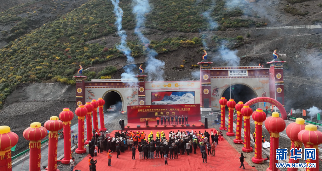 這是夏貢拉山隧道通車儀式現(xiàn)場(chǎng)(9月29日攝,無(wú)人機(jī)照片)。新華社發(fā)