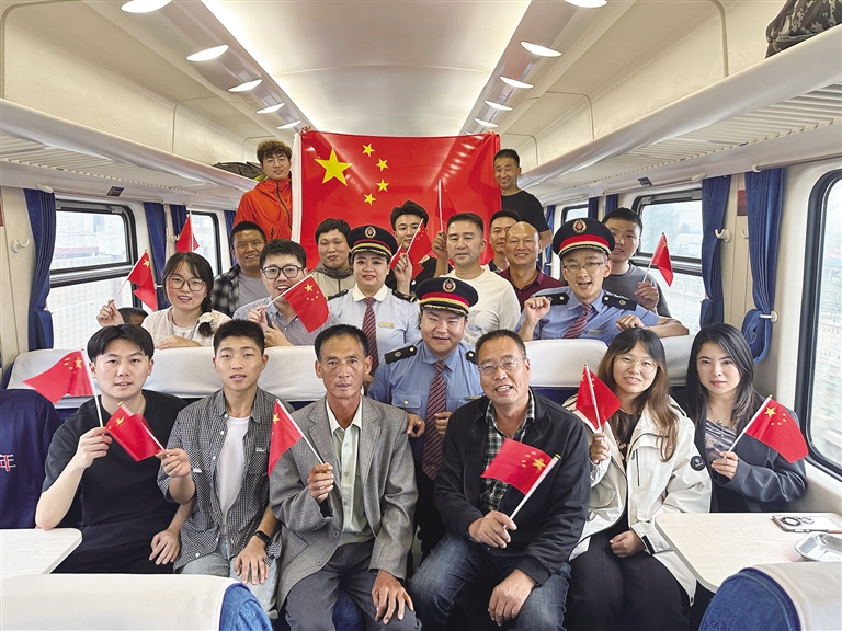 列車員與旅客合影慶祝國(guó)慶節(jié)。圖由周悅翔 楊寶森提供