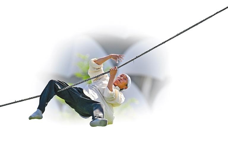 第十二屆全國少數(shù)民族傳統(tǒng)體育運動會,西藏隊選手表演《強(qiáng)桿踏許》。