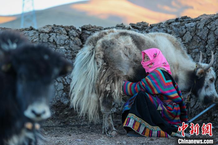 12月12日,西藏自治區(qū)那曲市安多縣帕那鎮(zhèn)牧民土巴卓瑪正準(zhǔn)備擠牦牛奶。中新社記者 貢嘎來(lái)松 攝