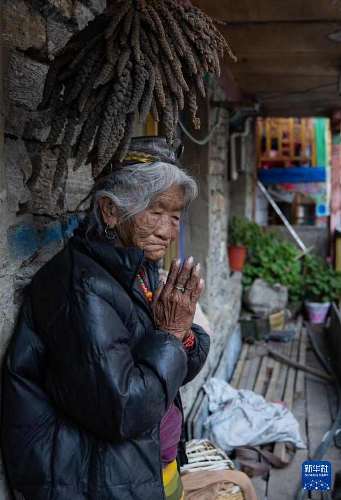 12月13日,一名陳塘鎮(zhèn)夏爾巴老人站在自家陽(yáng)臺(tái)上祈福。
