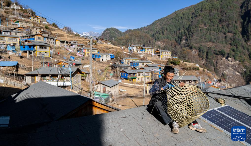 12月13日,陳塘鎮(zhèn)夏爾巴男子在自家屋頂編制竹簍。