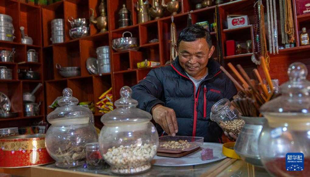 12月13日,一名夏爾巴男子在自家的土特產(chǎn)店里稱量貝母。