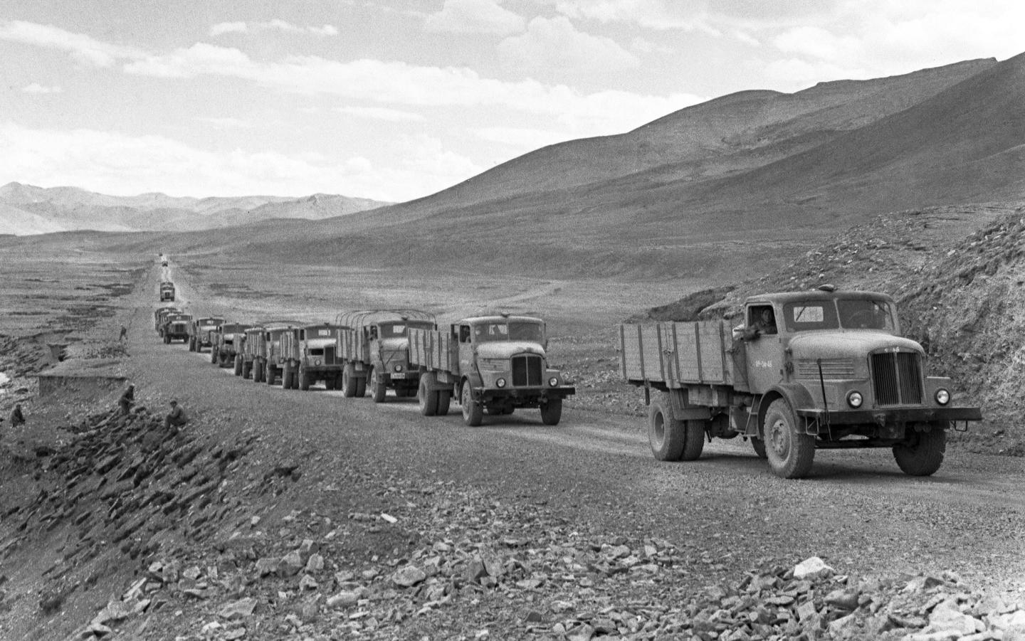 1958年,汽車隊行進(jìn)在青藏高原上。