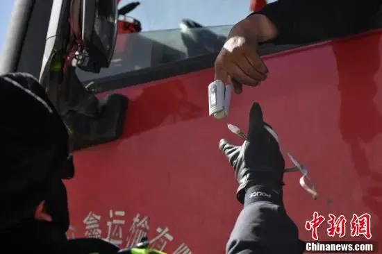 圖為交警為貨車司機測量血氧。中新社記者 貢嘎來松