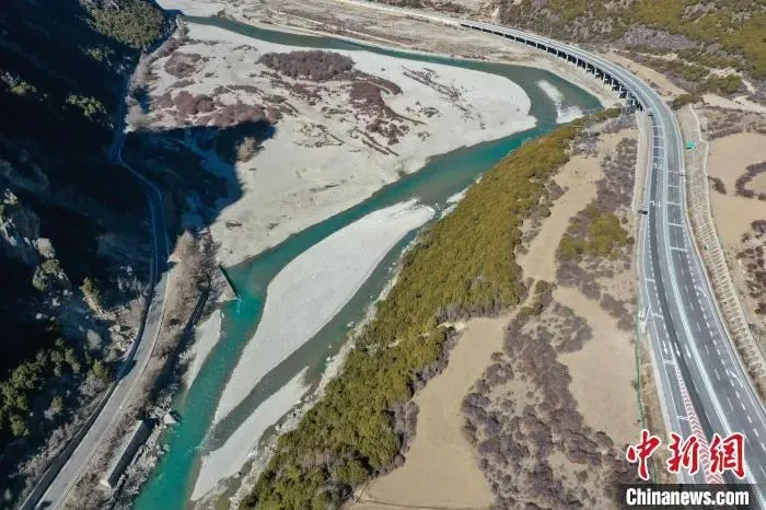 圖為部分養(yǎng)護路段(右)。(無人機照片)中新社記者 貢嘎來松 攝