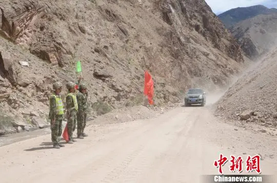 圖為護路期間,道班工人引導往來車輛。中新社記者 王磊 攝