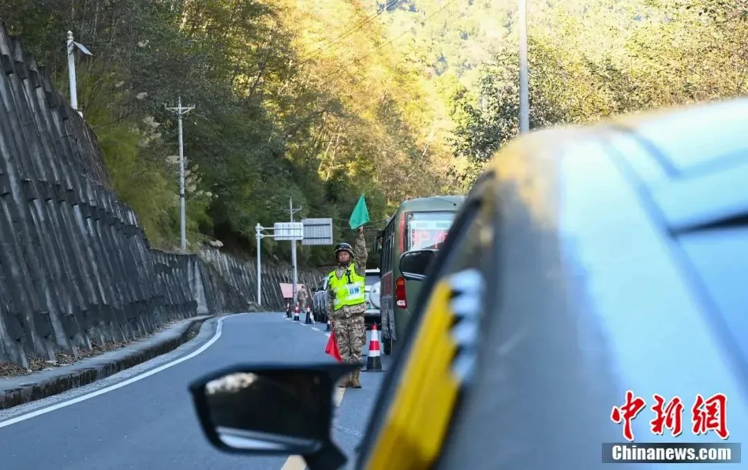 圖為管護完畢后,武警官兵放行等待車輛。中新社記者 趙朗 攝