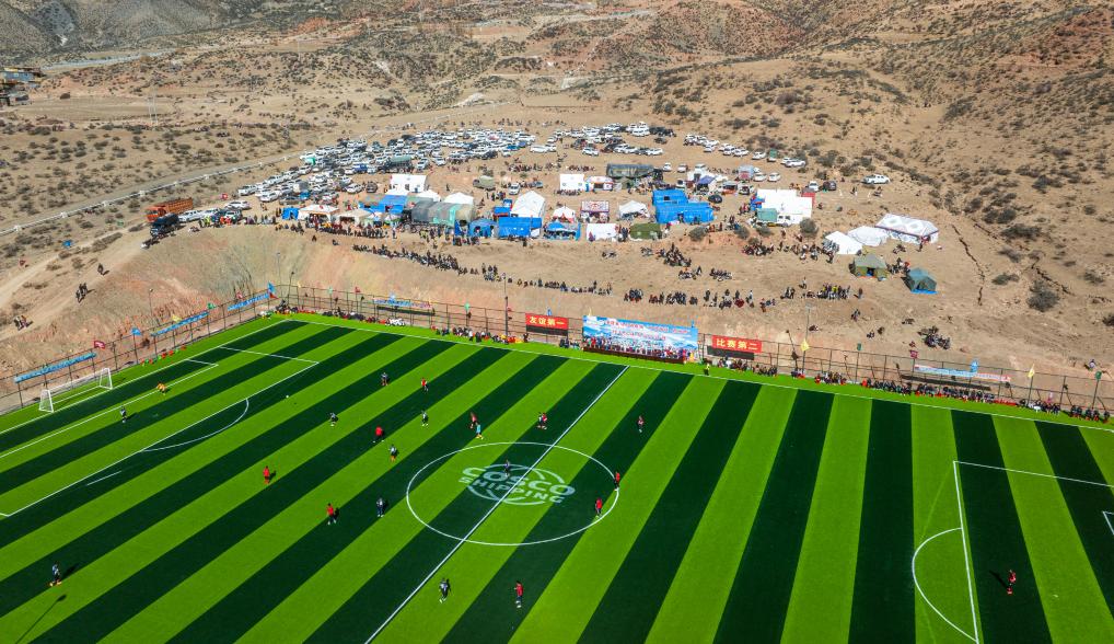 在馬利鎮(zhèn)“云中球場”,球員們正在比賽中(1月2日攝,無人機(jī)照片)。新華社記者 丁增尼達(dá) 攝
