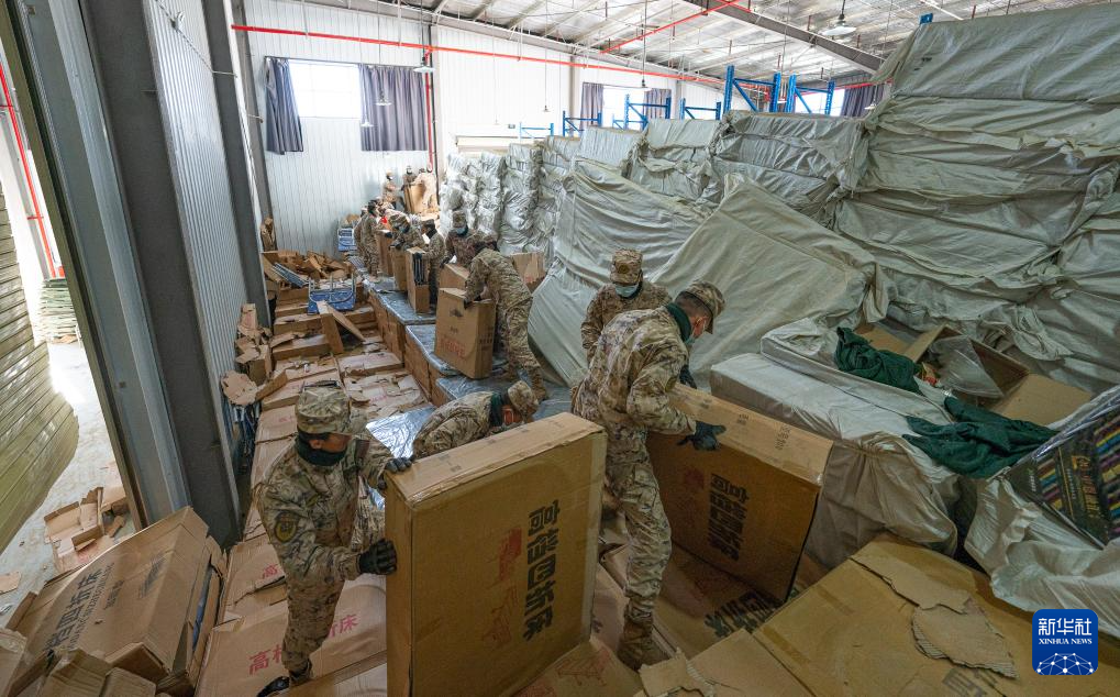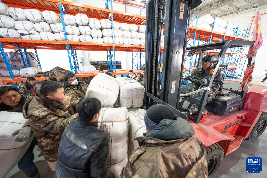 1月8日,在日喀則市經(jīng)開區(qū)物資儲備倉庫,武警官兵在搬運抗震救災(zāi)物資。新華社記者 丁增尼達 攝