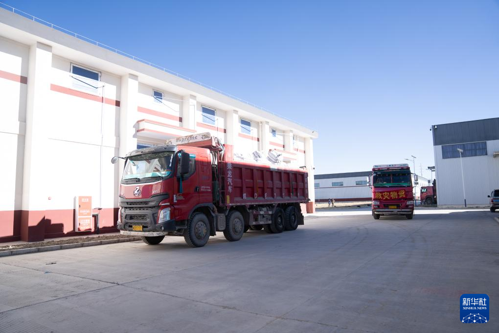 1月8日,在日喀則市經(jīng)開區(qū)物資儲備倉庫,裝好抗震救災(zāi)物資的車輛駛出園區(qū)。新華社記者 丁增尼達 攝