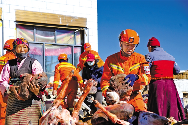 1月8日,在定日縣措果鄉(xiāng)美朵村,林芝市森林消防支隊消防員在協(xié)助受災群眾轉(zhuǎn)移冬季存放的羊肉。記者 索朗群培 攝