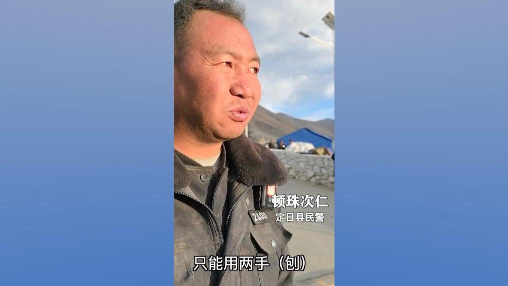 “我們用雙手把被埋人員刨出來。”定日縣公安局干警頓珠次仁的身上全是灰塵,臉上的汗水沖出一道道溝,雙手指甲里塞滿了泥土和血絲。