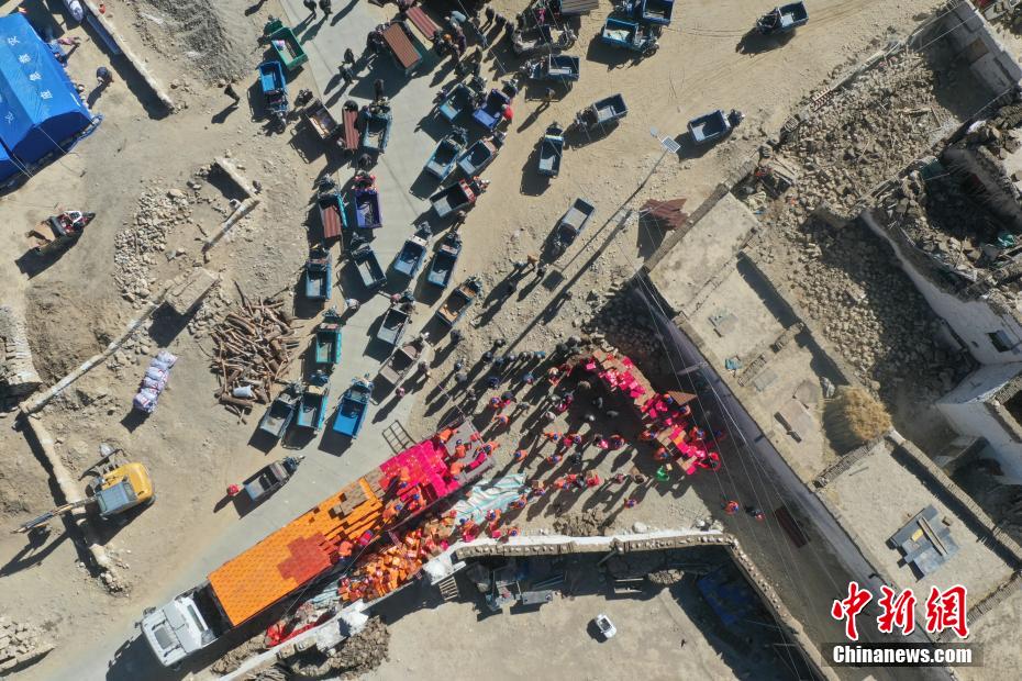 1月9日,西藏自治區(qū)定日縣曲洛鄉(xiāng)措昂村安置點,救援人員發(fā)放救災(zāi)物資床墊。當日,位于西藏自治區(qū)定日縣曲洛鄉(xiāng)措昂村安置點,西藏各級救援人員和愛心企業(yè)不斷轉(zhuǎn)運、發(fā)放生活物資、搭建安置板房、全力保障受災(zāi)民眾的飲食供應(yīng)等,保障受災(zāi)民眾基本生活。(無人機照片)中新社記者 貢嘎來松 攝