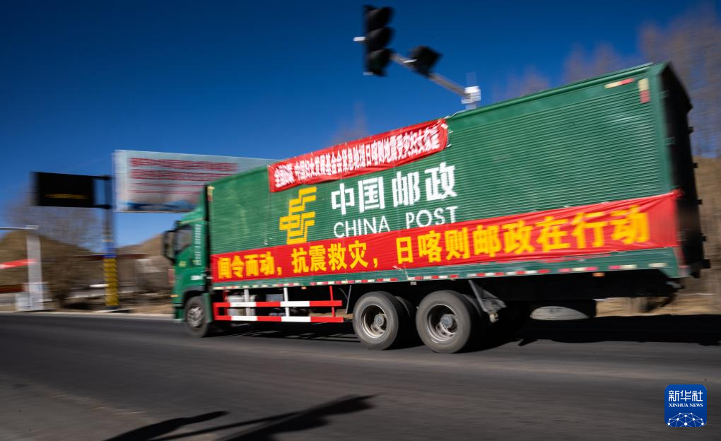 2025年1月8日,在日喀則,中國郵政的抗震救災物資運輸車輛向震中方向駛去。新華社記者 丁增尼達 攝