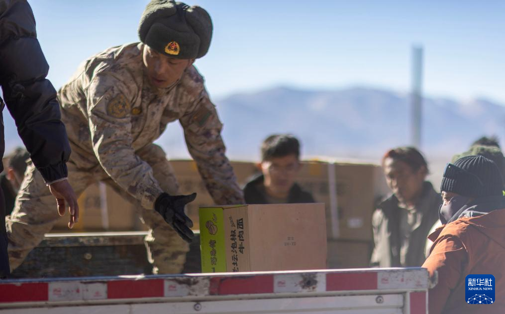 2025年1月8日,解放軍戰(zhàn)士在定日縣尼轄鄉(xiāng)雪龍村幫助受災群眾搬運生活物資。新華社記者 姜帆 攝