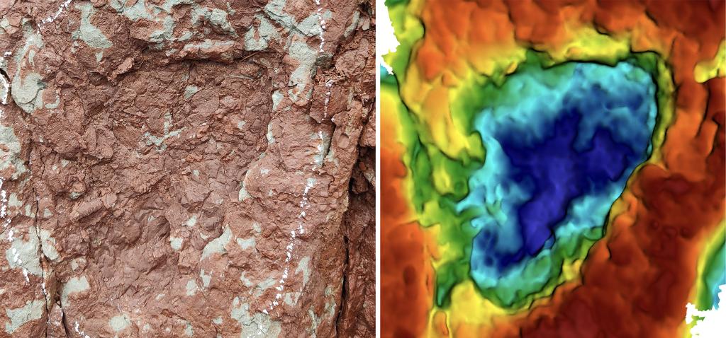 在西藏昌都市凍多村發(fā)現(xiàn)的小型蜥腳類(lèi)恐龍足跡與3D圖像。(受訪者供圖)