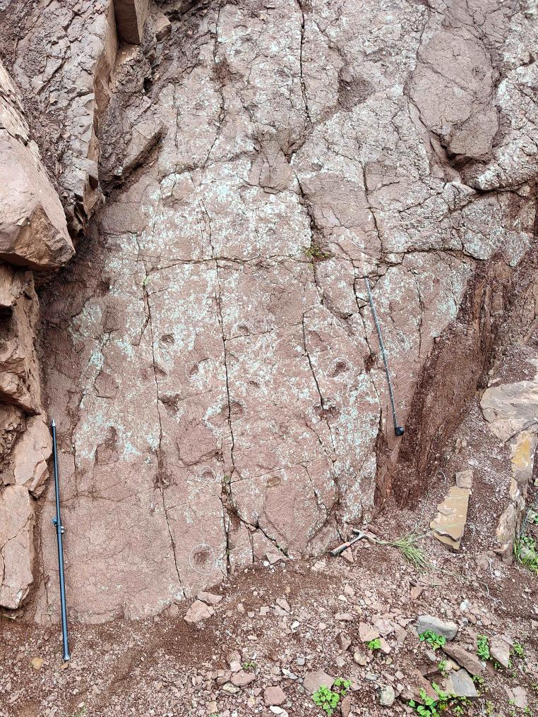 考察隊(duì)在凍多村發(fā)現(xiàn)了兩個(gè)足跡點(diǎn)。其中一處遺跡化石是尺寸較小、孤立的蜥腳類(lèi)恐龍足跡,大小從8.8厘米到15.5厘米不等,可能由6只以上恐龍留下。