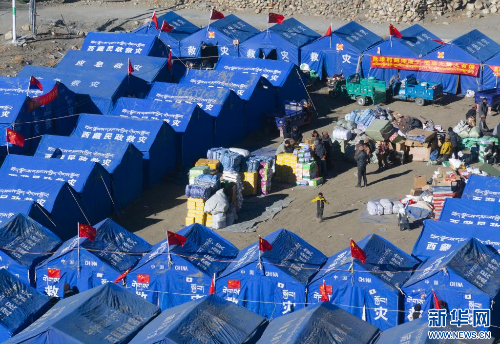 1月10日,在定日縣民族團(tuán)結(jié)廣場,人們搬運(yùn)將要運(yùn)往受災(zāi)群眾安置點(diǎn)的過冬物資。新華社記者 沈伯韓 攝