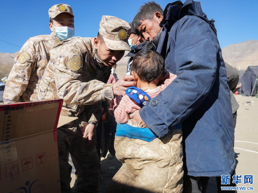 1月8日,在長所鄉(xiāng)森嘎村臨時(shí)安置點(diǎn),西藏軍區(qū)總醫(yī)院醫(yī)療隊(duì)隊(duì)員為小朋友治療。 新華社記者 丁汀 攝