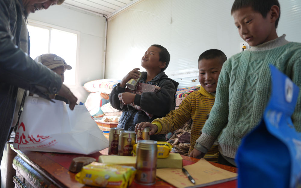 1月27日,加嘎村安置點受災(zāi)群眾在領(lǐng)取新年大禮包。新華社記者 晉美多吉 攝