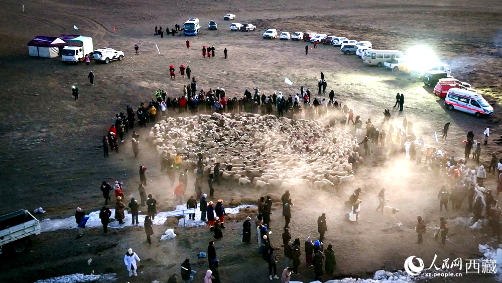 隨著一聲號令,牧民們驅(qū)趕著羊群,踏上冰封的湖面。遠(yuǎn)遠(yuǎn)望去,羊群如同一串串黑白相間的珍珠,在湛藍(lán)的冰面上緩緩移動,構(gòu)成一幅壯美的高原畫卷。