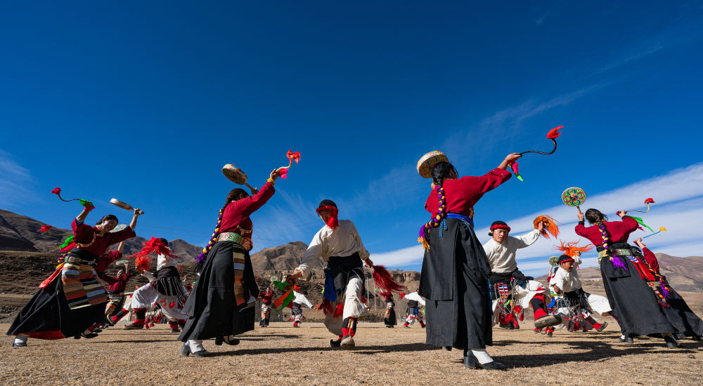 這一傳承了千年的藏族傳統(tǒng)舞蹈是一種鼓舞,也是一種融說、唱、舞、雜技為一體的綜合性表演藝術(shù)。與悠揚(yáng)舒緩的鍋莊舞不同,熱巴舞的騰躍、旋轉(zhuǎn)動作極具視覺沖擊力,鼓鈸的鏗鏘聲中盡顯高原兒女的豪情壯志。每逢藏歷新年或豐收慶典,熱巴舞都是最隆重的文化盛宴,深受當(dāng)?shù)厝罕娤矏邸?/p>