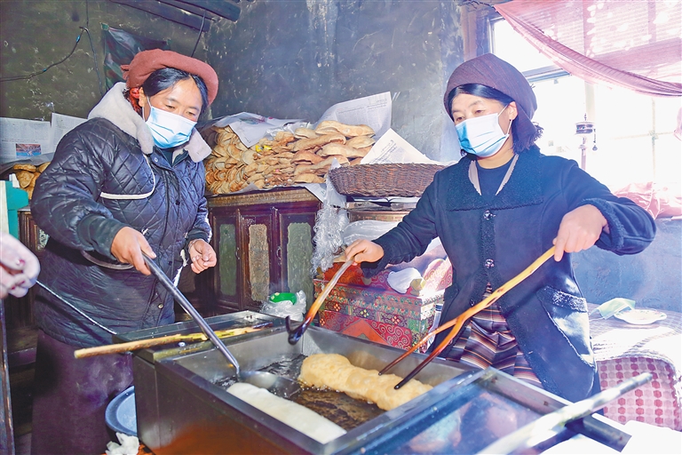 旦索朗一家,在每年藏歷新年前夕,都會(huì)開啟一年中最為繁忙的時(shí)光——經(jīng)營(yíng)“卡賽”生意。旦索朗回憶往昔,感慨萬(wàn)千:“小時(shí)候過(guò)年,炸‘卡賽’是家家戶戶的頭等大事,整個(gè)村子都彌漫著誘人的香氣,那是新年專屬的味道。如今,時(shí)代在變遷,人們的生活方式也發(fā)生了改變,越來(lái)越多的人選擇購(gòu)買成品‘卡賽’,這既契合了快節(jié)奏的現(xiàn)代生活,也為我們提供了發(fā)展的機(jī)遇。我們經(jīng)營(yíng)‘卡賽’生意已有6年,這期間,靠著誠(chéng)信經(jīng)營(yíng)和對(duì)高品質(zhì)的堅(jiān)守,生意蒸蒸日上,還帶動(dòng)了6名村民共同增收,大家一起用雙手創(chuàng)造美好生活?!?/p>