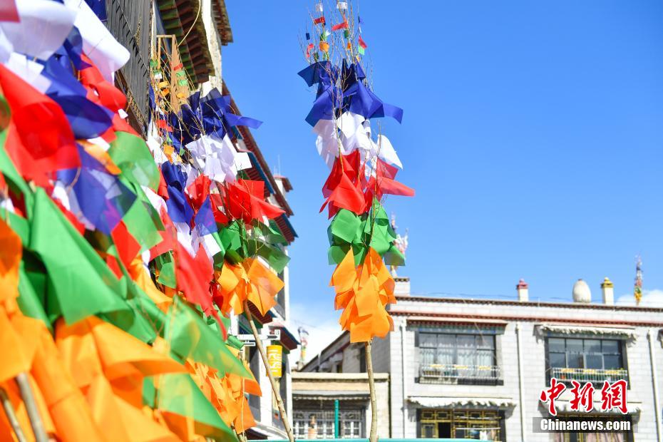 臨近藏歷新年,2月16日,在西藏拉薩街頭,農(nóng)牧民正縫制五彩經(jīng)幡樹。五彩經(jīng)幡樹是藏族民眾在藏歷新年前必備的年貨之一。藏歷新年期間,藏族民眾會(huì)選擇一個(gè)良辰吉日,為自家的房頂更換五彩經(jīng)幡樹,祈求新的一年里五谷豐登,吉祥如意。圖為2月16日,普瓊在給顧客展示五彩經(jīng)幡樹。貢確 攝