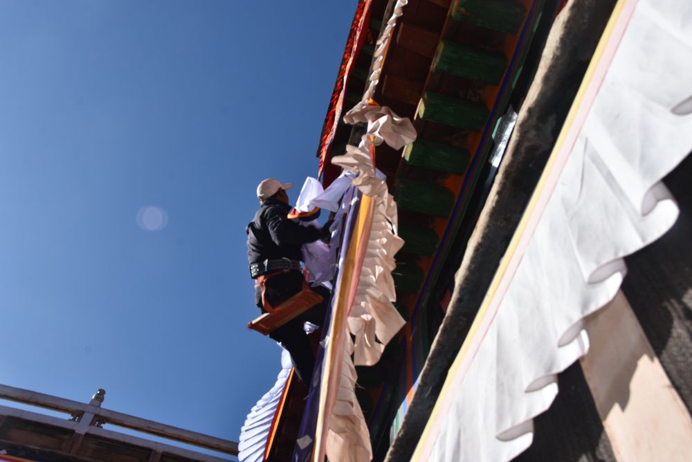 “布達(dá)拉宮門窗眾多,需要更換總長近1萬米的‘香布’及數(shù)百個門簾、窗簾等?!辈歼_(dá)拉宮管理處維修科科長扎西平措介紹,為確保在藏歷新年前完成所有工作,管理處根據(jù)往年慣例提前10天左右開始更換作業(yè)。