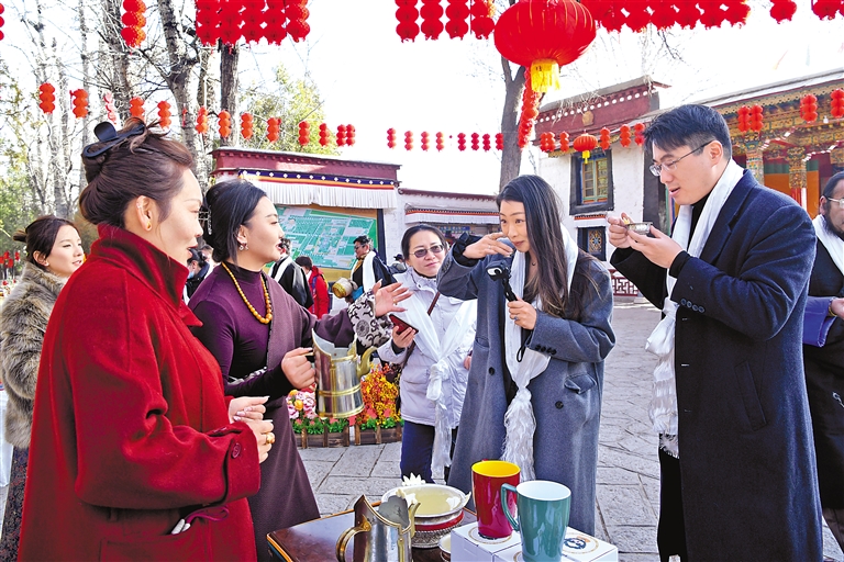 隨著一聲聲“扎西德勒!”“新年快樂!”的祝福語響起,身著盛裝的工作人員站在切瑪盒旁邊,熱情地教游客吃“切瑪”。“切瑪”盒里滿滿的青稞粒和糌粑,再加上金燦燦的酥油花和染成紅綠兩色的“羅薩梅朵”麥穗的裝點(diǎn),象征著五谷豐登、福澤綿長。來自廣東的游客張女士一家是專程趕來過藏歷新年的,想來體驗(yàn)不同年味兒的她輕捏一撮切瑪撒向空中:“愿我們?nèi)医】灯桨?,也祝祖國繁榮昌盛!”
